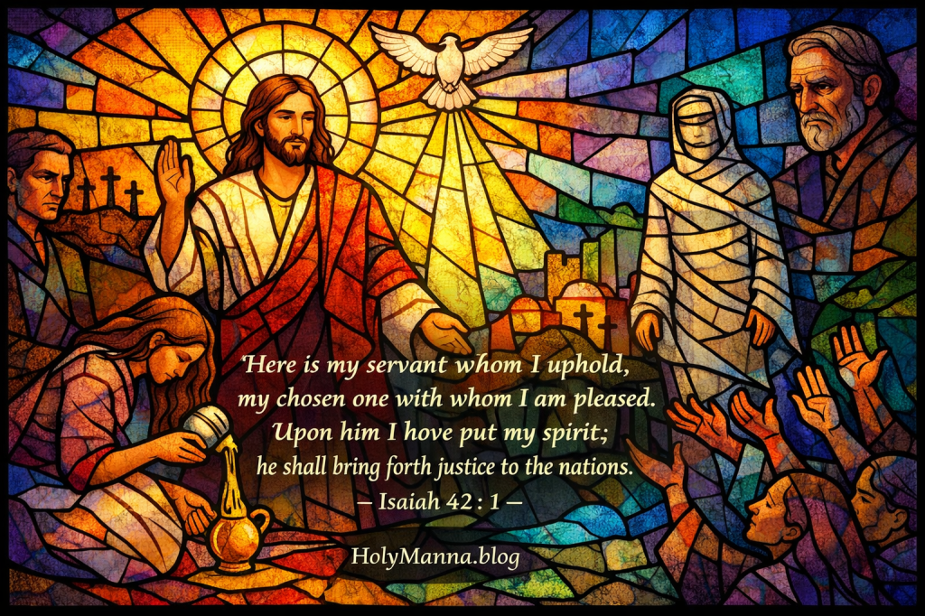 The Church also sees in this passage a strong connection to the Baptism of the Lord. The Father’s pleasure in the Servant and the gift of the Spirit point directly to Christ revealed in the Jordan. The Catechism says in CCC 536: “The Holy Spirit comes upon Jesus and the voice from heaven proclaims him the beloved Son of the Father. This is the manifestation (‘Epiphany’) of Jesus as Messiah of Israel and Son of God.” That moment in the Jordan is not separate from Holy Week. It leads to Holy Week. The One publicly revealed there now walks steadily toward the Cross.