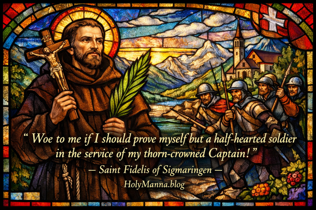 One of the sayings traditionally attributed to him reveals the fire of his soul: “Woe to me if I should prove myself but a half-hearted soldier in the service of my thorn-crowned Captain!” That line tells the whole story. Saint Fidelis did not want to belong to Christ halfway.