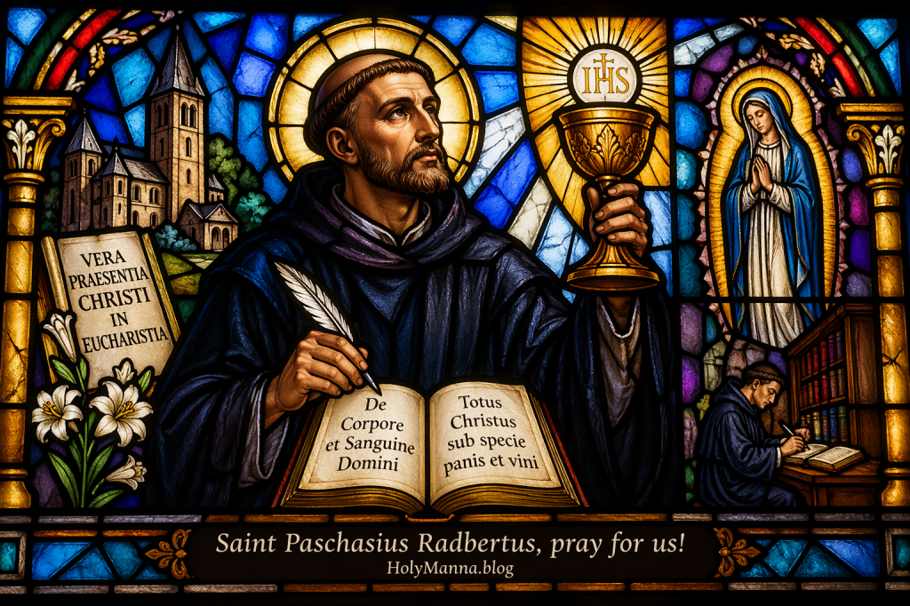 Saint Paschasius Radbertus is one of those saints who may not be widely known in every Catholic household, but his legacy quietly reaches the altar at every Mass. He was a Benedictine monk, later an abbot, and one of the great theological minds of the ninth century. He is especially revered for defending the truth that the Holy Eucharist is truly the Body and Blood of Jesus Christ. In a time when the Church was still working out how best to explain this mystery, Paschasius spoke with unusual boldness and clarity.
