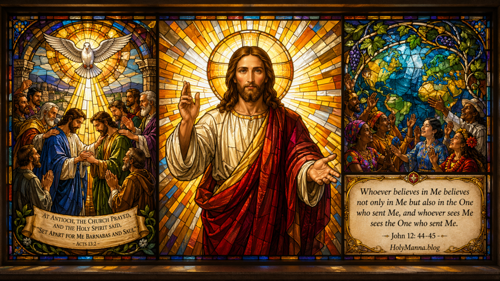This Gospel fits perfectly with today’s theme. In Acts 12:24-13:5, the Word of God spreads and grows as the Holy Spirit sends Barnabas and Saul. In Psalm 67, God blesses His people so that His way may be known among all nations. In John 12:44-50, Jesus reveals the source of that mission: the Father sends the Son as Light, and the Son speaks the saving Word that leads to eternal life.